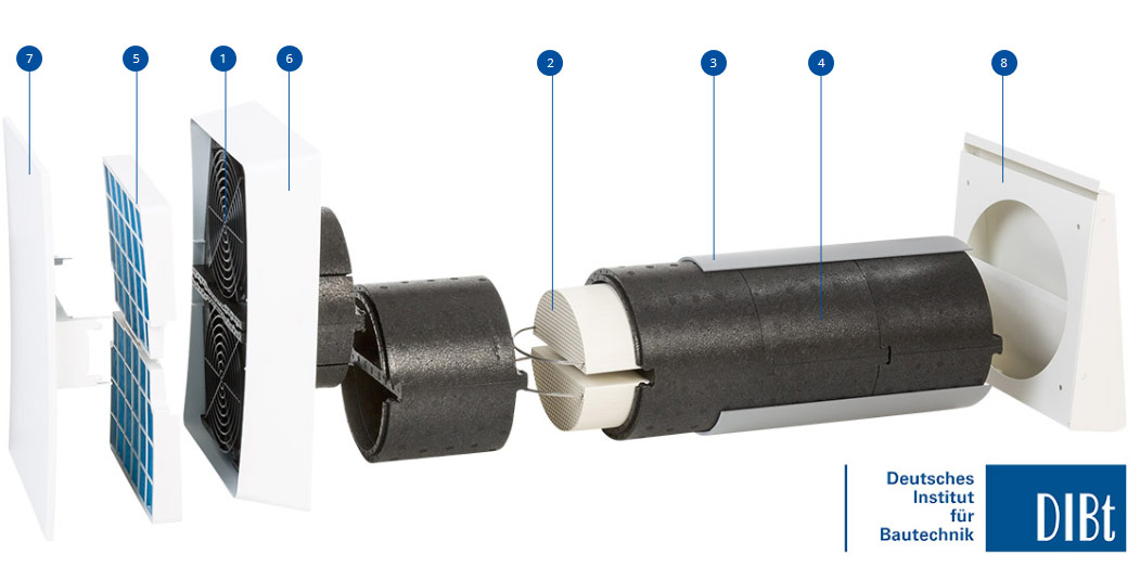 Umgeben sind die Wärmespeicher vom Installationsgehäuse. Dieses besteht aus einer Polypropylen-Hülse (Wandeinbauhülse) (3) , Außendurchmesser 160 mm. Darin wird das 2-Kanal EPP-Gehäuse (4) (Expandiertes Polypropylen) eingeschoben. Beide Luftkanäle werden jeweils mit einem passenden Wärmespeicher (2) bestückt. Das „Spezial-Schaummaterial“ des EPP-Gehäuses hat eine sehr gute, schalldämmende Wirkung für Körper- und Luftschall. Gleichzeitig ist es eine optimale Isolierschicht gegen Kälte- bzw. Wärmebrücken.